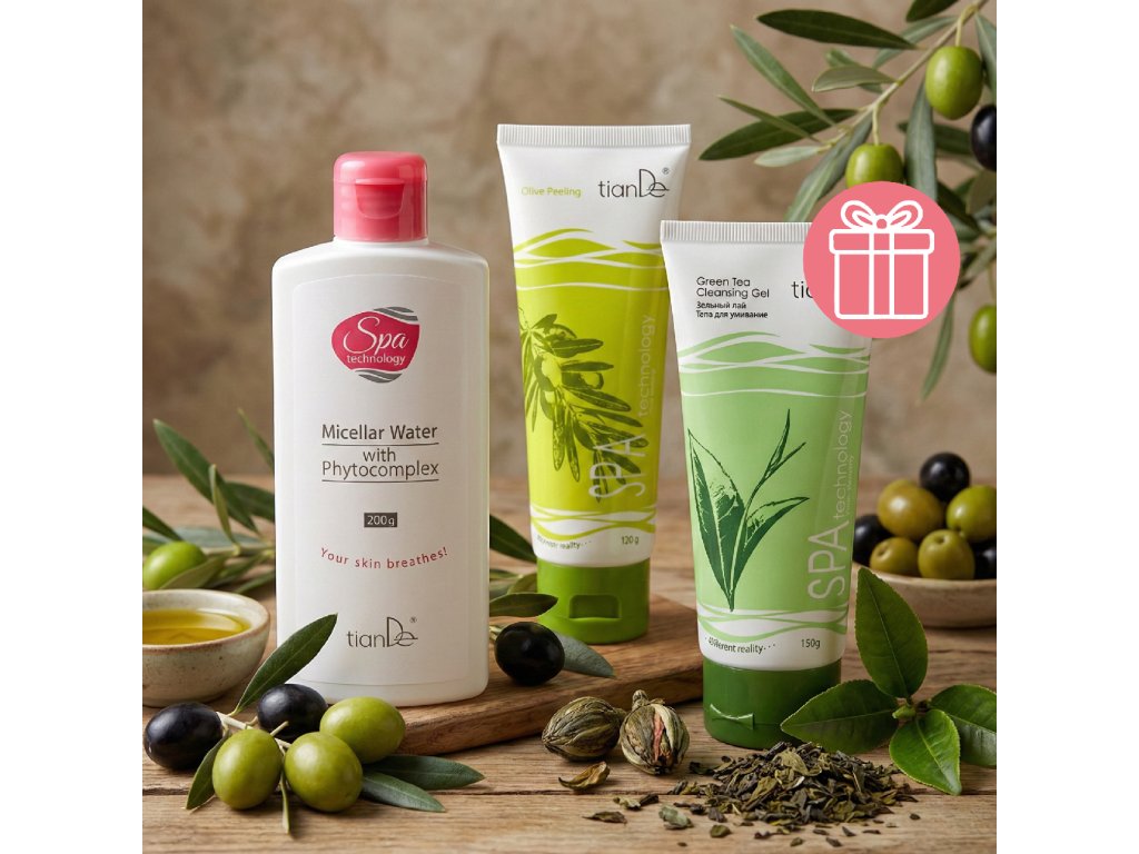 Doprajte svojej pleti starostlivosť inšpirovanú Stredomorím. Tento set kombinuje jemné odlíčenie bylinami, antioxidačné umývanie zeleným čajom a peeling s olivovým olejom, ktorý pleť nielen čistí, ale aj okamžite zjemňuje a vyživuje.
