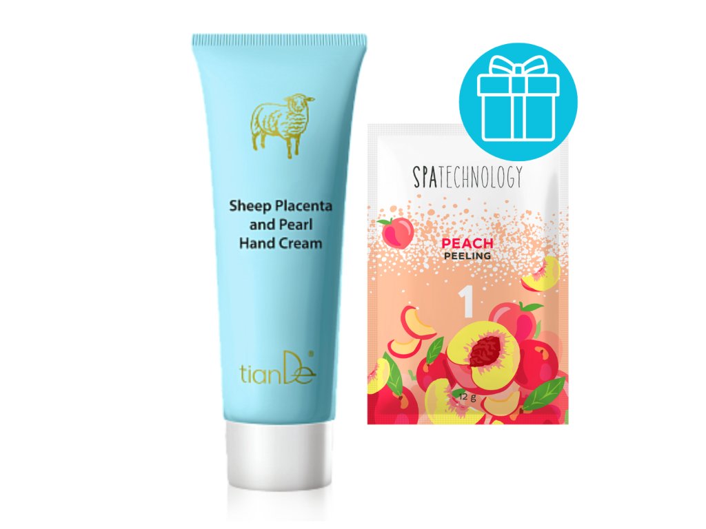 AKCIA 09. - 10. Krém na ruky s placentou a perlovým práškom a ako DARČEK získate Peeling na telo "Broskyňa"_1.7b
