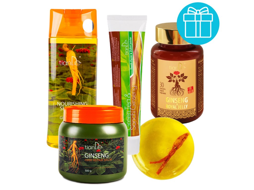 AKCIA 09. - 10. Vyživujúci šampón s koreňom ženšenu + Obnovujúci balzam s výťažkom ženšenu + Zubná pasta "Zelený čaj a ženšen Sanchi" + Telové mydlo so ženšenom a ako DARČEK získate Ženšen a materská kašička_26.8b